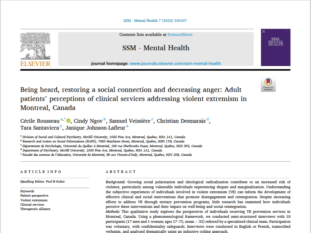 Being heard, restoring a social connection and decreasing anger: Adult patients’ perceptions of clinical services addressing violent extremism in Montreal, Canada